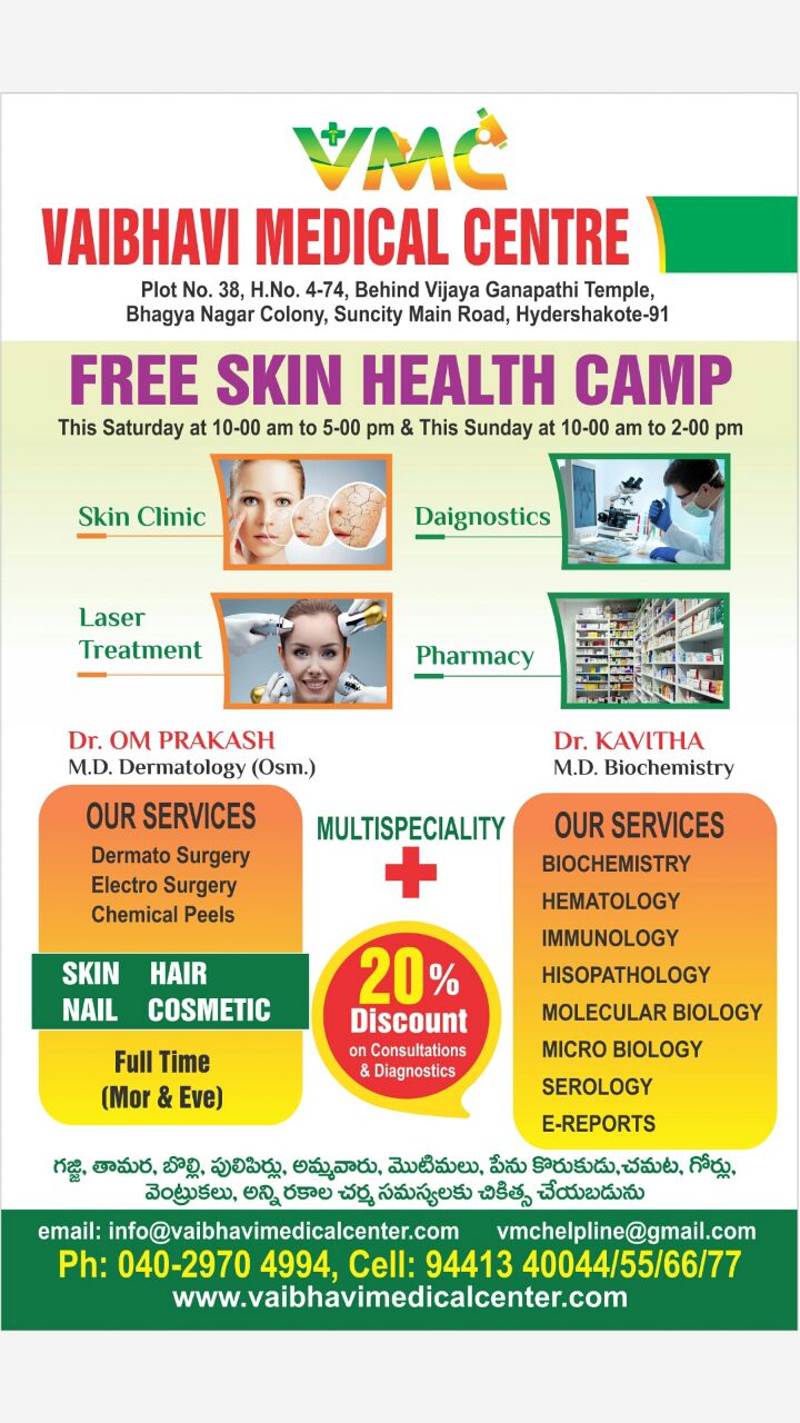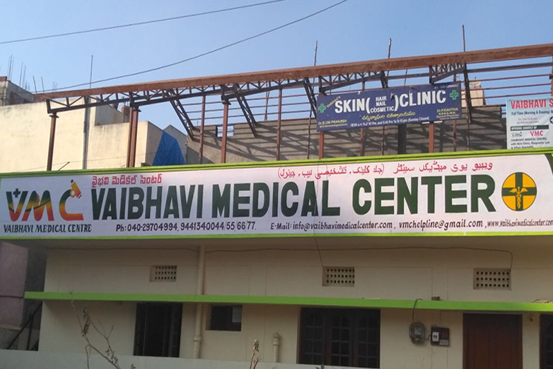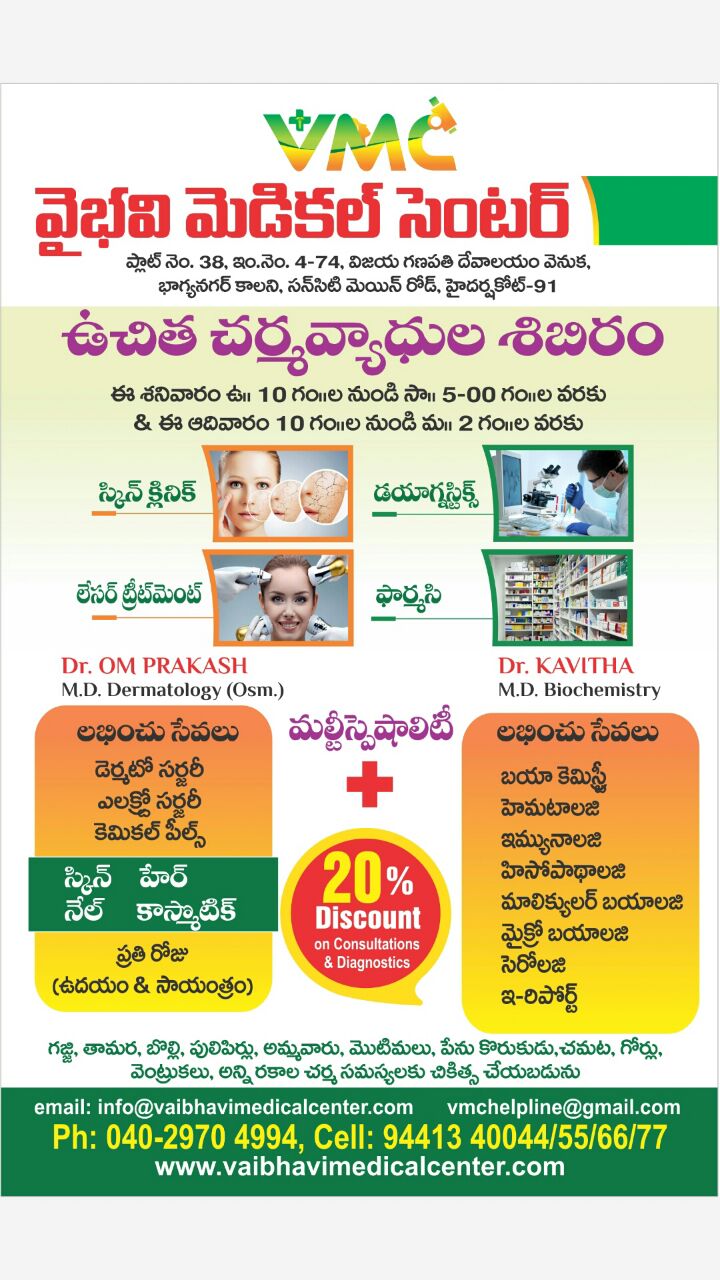 Vaibhavi Medical Center was one of the best rated Medical Center in middle of the Hyderabad SunCity Near Langar Houze.Its consist of Senior MD Dermatologist leading Skin Clinic, Senior Bio-Chemist MD Docotor Leading Diagnostic Center with fully automated lab To Do Blood and other tests.It Consist Other Facilites Like Multi Speciality Clinics & pharmacy. Vaibhavi Skin Clinic was established in the year 2005 By DR. B Om Prakash,M.D Dermatology(Osm). After 11 years of career of Vaibhavi Skin Clinic, Dr. Kavitha MBBS,M.D Bio Chemistry has joined and started Vaibhavi medical center in 2017. They decided to Provide their Extensive Services to all old & New patients, near and dears in one setup only. Vaibhavi can provide best services to patients in their own Fully Sophisticated Premises. By considering Vaibhavi's previous patients Economical Status, they can give best services at very reasonable cost. they have Advanced skin clinic with morning,Afternoon and evening slots. To have the appointments, patients can reach by the Contact Numbers given below out of which one is land line and remaining four are Mobile. Home Visit Facility Avaible by Lab Technician, Nurse for sample collection and nursing care. Oldaged and other weak Patients may be attended by Doctors at your door step by prior appiontment.
